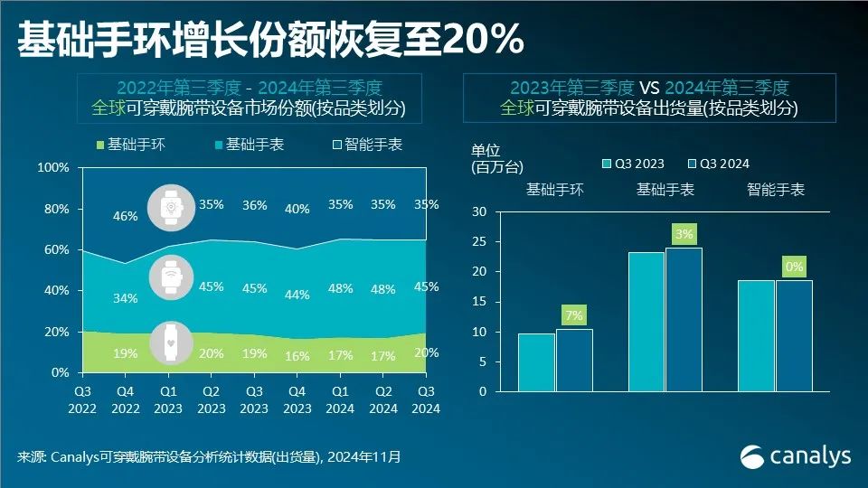在近期发布的小米手环 9 和三星 Galaxy Fit3 的激动下,基础手环市集自 2020 年第三季度以来初度收复增长,比拟 2023 年第三季度,增幅达 7%,出货量为 1,040 万台。