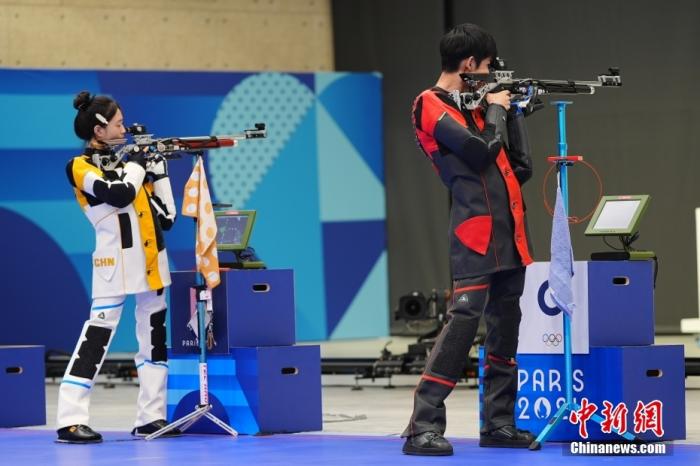 当地时候7月27日,在法国沙托鲁举行的巴黎奥运会射击10米气步枪夹杂团体决赛中,中国组合黄雨婷/盛李强取得金牌。图为黄雨婷(左)/盛李豪在比赛中。中新社记者 赵文宇 摄