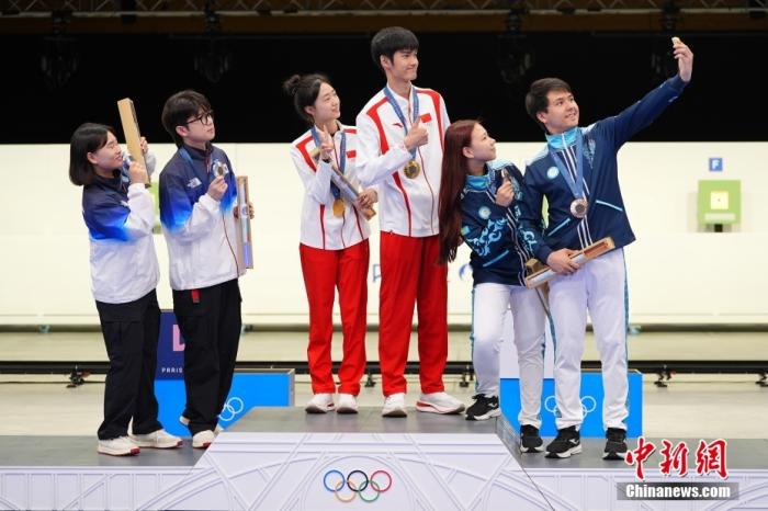 当地时候7月27日,在法国沙托鲁举行的巴黎奥运会射击10米气步枪夹杂团体决赛中,中国组合黄雨婷/盛李强取得金牌。这亦然本届巴黎奥运会出生的首枚金牌。图为获奖选手在授奖庆典上自拍。中新社记者 赵文宇 摄