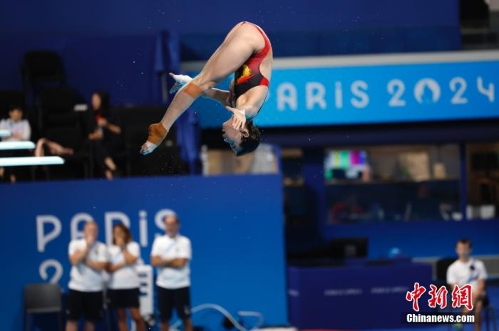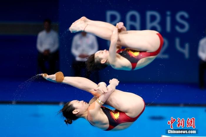 当地时候7月27日,中国组合昌雅妮(下)/陈艺文在比赛中。当日,在巴黎奥运会跳水女子双东说念主3米板决赛中,中国组合昌雅妮/陈艺文夺得金牌。 中新社记者 富田 摄