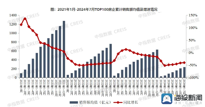 中指询查院数据:2021年1月-2024年7月TOP100房企累计销售额均值及增速情况。