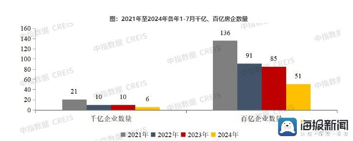 中指询查院数据:2021年至2024年各年1-7月千亿、百亿房企数目。